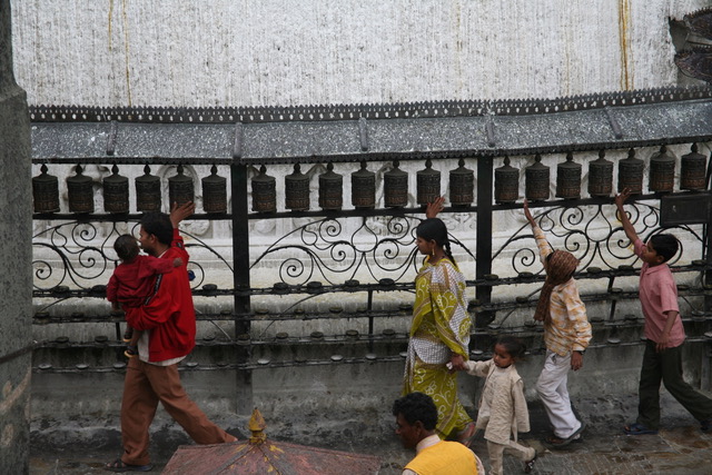 In this photo you see a family spinning the prayer wheels